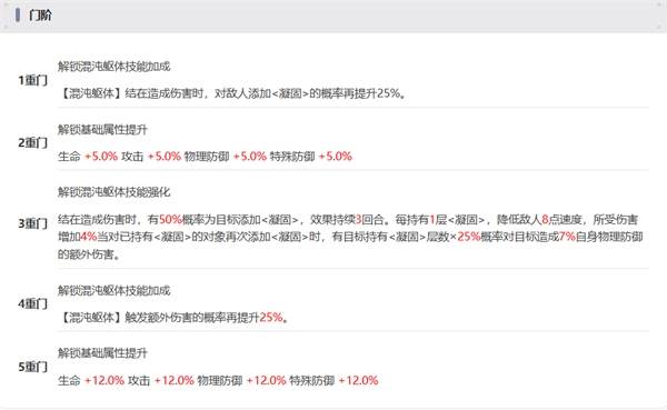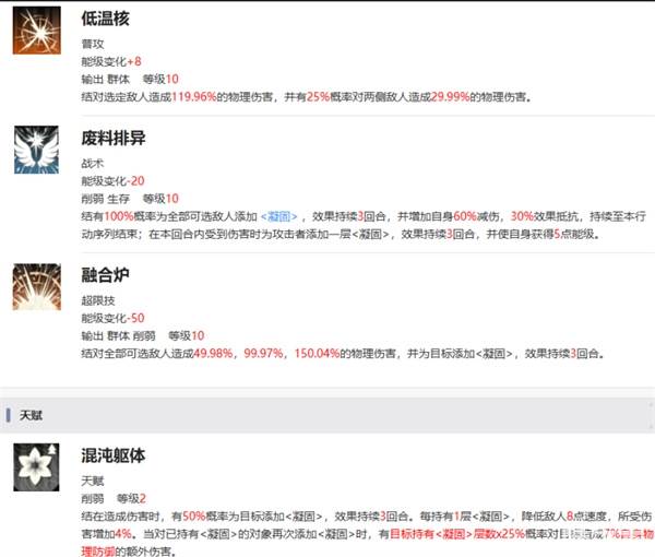 结的前期作用并不明显,主要通过给对手增加易伤和减速(拉回合条)来间接提升全队的输出保障。虽然其基础数值面板相比其他六星角色略显不足,但结的技能和大招能有效挂上易伤状态,且这一状态可以持续六回合(3+3),为技能的回能提供了良好条件。结的技能等级越高,命中概率也会提升,能够更频繁地为敌方施加易伤。