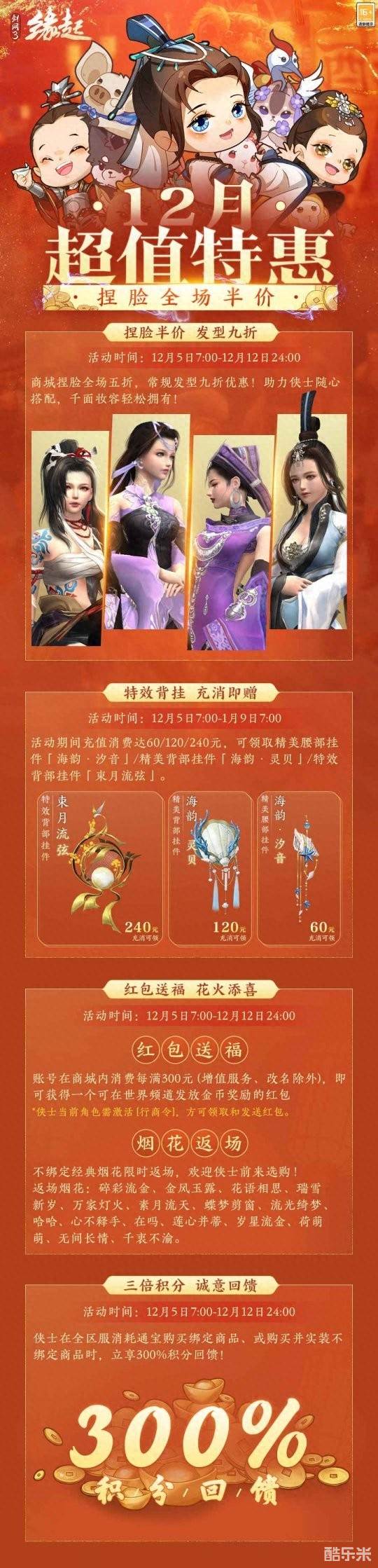 岁末将至,寒风瑟瑟,《剑网3缘起》十二月特惠活动火热开启!美妆盛典优惠回馈,崭新衣装琳琅满目,还有超多福利惊喜等你获取,快来一起看看吧!