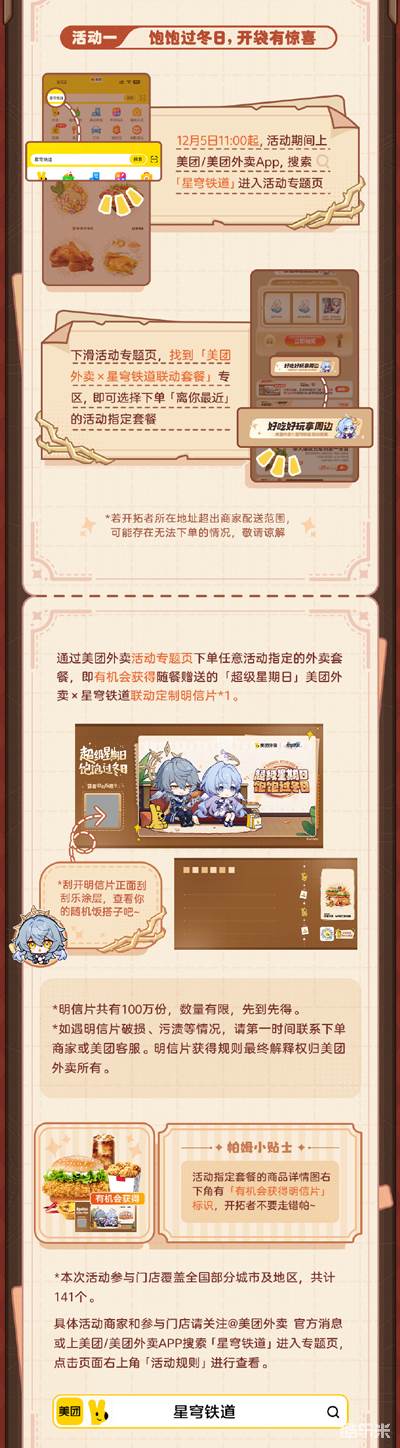 1、活动期间美团外卖活动专题页下单「美团外卖×星穹铁道联动套餐」;