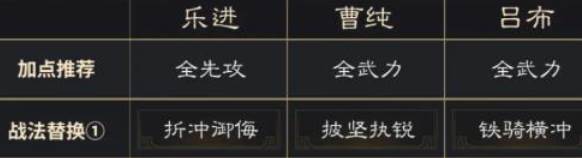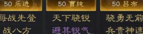 乐进优先选择专属韬略《同登》,其余可选《先勇》、《抵力》;