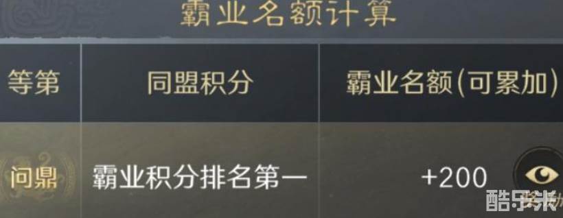 想要获得霸业,首先看同盟霸业名额,判断同盟是否有以及有多少霸业名额数量;其次则是看自身在同盟内的个人赛季积分榜盟内排名,确认自己的排名是否在同盟霸业名额内。当以上两个条件都满足时,就可以获得霸业名额。