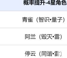 活动期间,限定5星角色景元(智识-雷),4星角色青雀(智识-量子)阿兰(毁灭-雷)停云(同谐-雷)跃迁成功概率限时提升。
