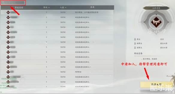3、打开帮派界面,选择一个满意的帮派,点击申请入帮即可。