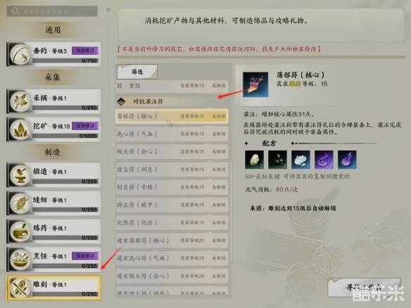 雕刻可以制作对抗类灌注符(PVP)和秘境类灌注符(PVE)。