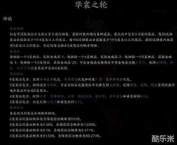 1、女娲石需要通过华裳之轮抽取,官方已经贴心地帮我们计算了含保底综合概率为1.239%。