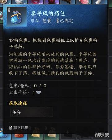 诛仙世界12格背包又名李寻风的药包,帮他找到遗落的药包后,我们也可以获得这个包裹了,那么12格背包怎么获得呢?前往河阳城烹饪台左边的巷子里接取寻找背包的任务,跟着提示走就可以拿到背包了。下面和酷乐米小编一起来看看吧