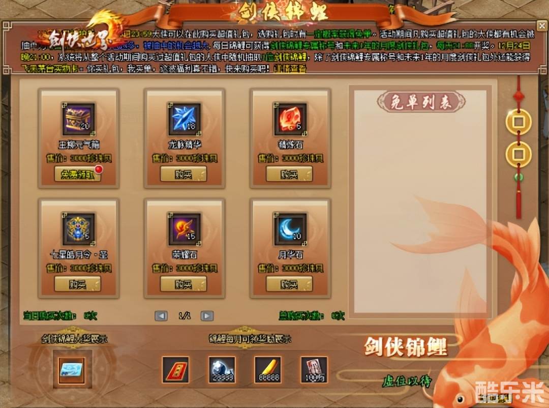 领取免费礼包以及选购活动珍珠贝礼包,即可参与锦鲤抽奖!抽中锦鲤即可获得超稀有锦鲤称号以及未来1年的游戏粮票,每月可领大量的绑金与稀有材料!更有机会抽中“超级剑侠锦鲤”,将会额外获得飞天茅台奖励!