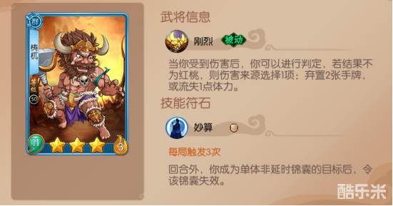 ①2星【妙算】:回合外,成为单体非延时锦囊,失去1点怒气回复1点体力,可发动次数:3次