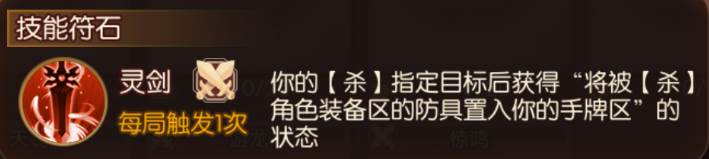 【灵剑】可以说是菜刀将的福音,对于只能靠“杀”来制造输出的武将来说,【灵剑】可以有效抑制敌方装备“八卦阵”、“龙鳞铠”及其他装备牌的情况,不但能夺取敌方的装备,还能提高“杀”的命中率。