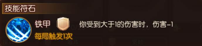 【铁甲】作为系统第一个赠送的符石,可以说是万金油般的存在。无论是关羽这样的高输出武将,或是周瑜、貂蝉这样的摸牌型武将,又或是司马懿这样的卖血型武将,均可以佩戴【铁甲】,无论是征战天下模式还是排位赛,【铁甲】总能够在关键时刻抵挡住一点伤害