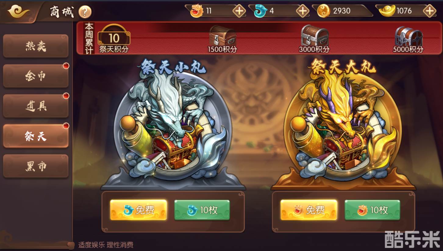 点击游戏右下角的“符石”图标进入“符石系统”,然后点击 “祭天”按钮进入祭天界面,即可参与祭天。玩家每日可免费使用一次祭天大礼与一次祭天小礼!祭天是获得【符石】、【符石碎片】、【武将】、【武将碎片】的主要方式之一。