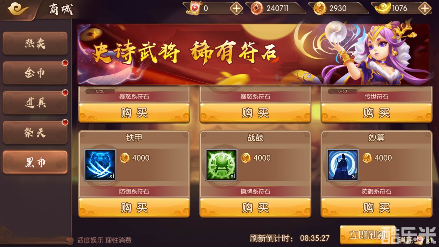 点击游戏右下角的“商城”进入 “商城”页面,选择“黑市”选项,即可查看到今日“黑市”出售的道具。“黑市”每隔12小时就会刷新一次,玩家可在黑市内购买到完整的符石。