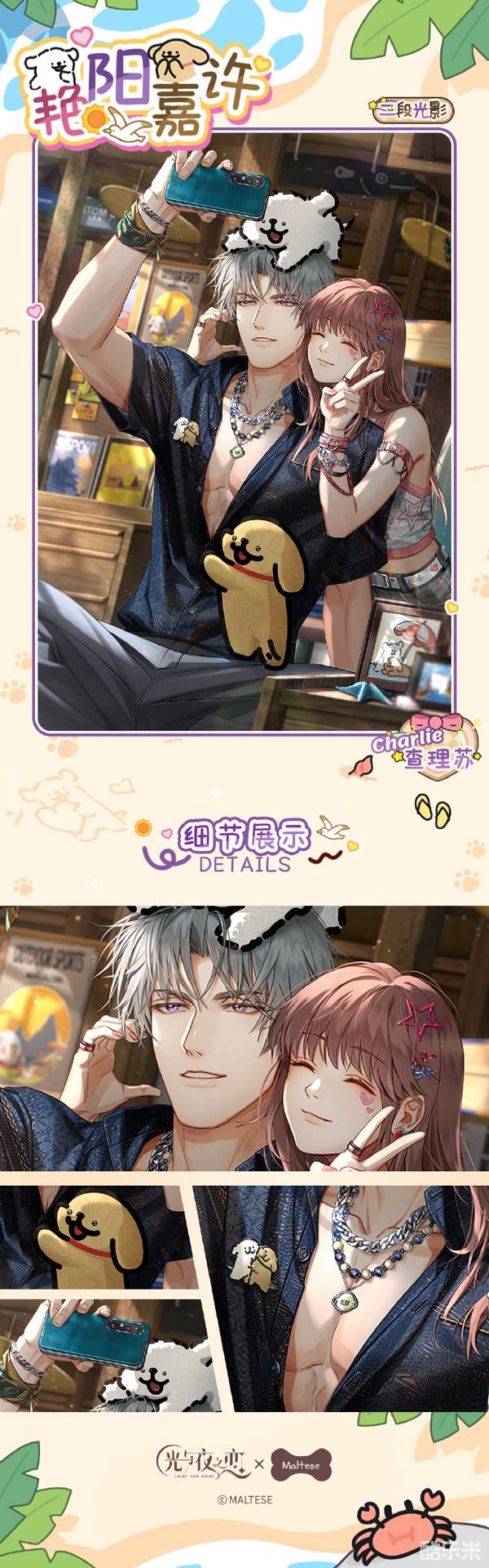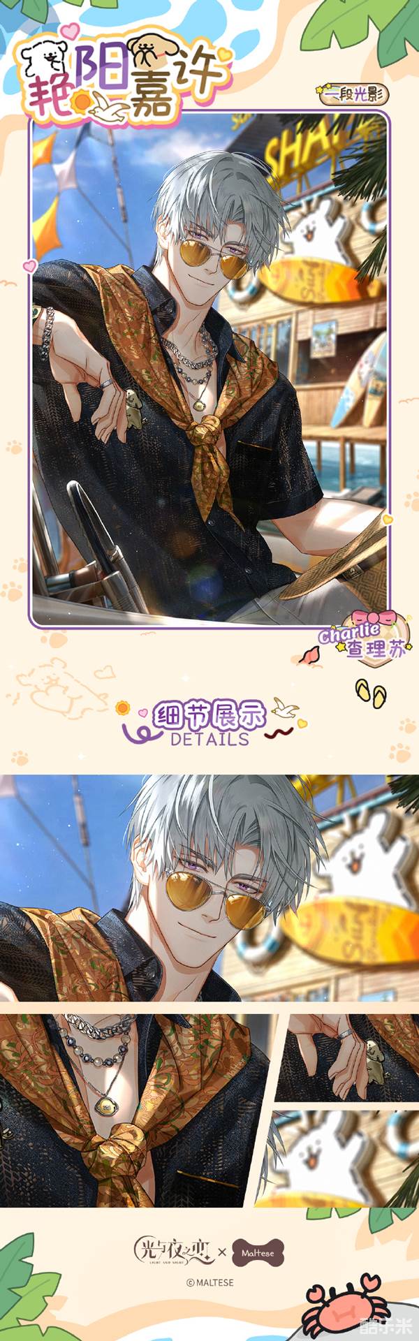 艳阳嘉许是光与夜之恋在和线条小狗联名活动中上线的全新灵犀卡面,给到了查理苏,将会在【恋爱公告】的限定收信活动中上线卡池,大家可在该卡池内抽取限定灵犀,想必玩家们对此次的卡面精致度和细节绘画上比较的关心,下面和酷乐米小编一起来看看吧