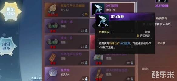 逆水寒中一些动作需要参与活动才能获取,很多玩家都想知道特殊动作冰行旋舞怎么获得,参加【踏雪游冬】活动拿雪精灵需要累计兑换使用至少200个雪精灵,在兑换奖励页面即可免费购买动作,接下来酷乐米小编给大家带来了详细的《逆水寒手游》特殊动作冰行旋舞获得方法!