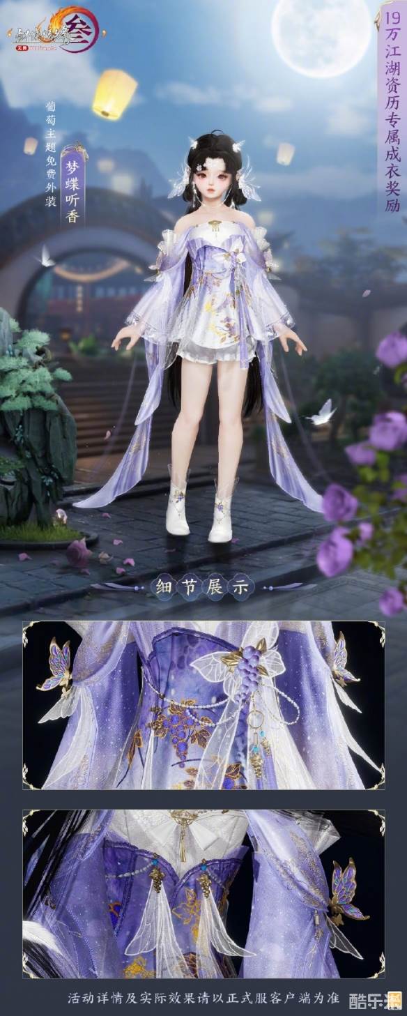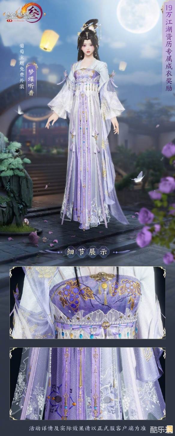 梦蝶听香会在12月23日上线游戏,很多玩家想知道成衣梦蝶听香长什么样,时装以葡萄为主题,主要的配色为紫色和白色,外观【梦蝶听香】为免费时装,是19万江湖资历专属奖励,接下来酷乐米小编给大家带来了详细的《剑网3》成衣梦蝶听香外观一览!