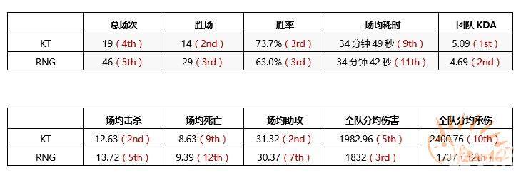 注:KT数据为2017LCK夏W1-4,RNG数据为2017春季赛。名次为各自联赛的排名,不具绝对可比性。