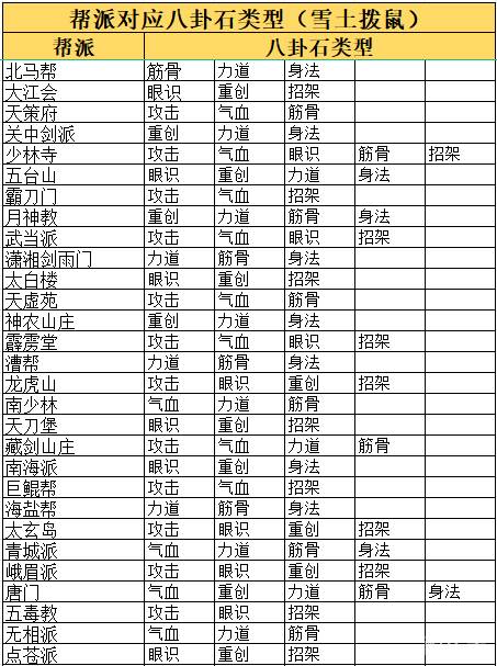 2.本土帮派兑换,帮派对应八卦石类型如下: