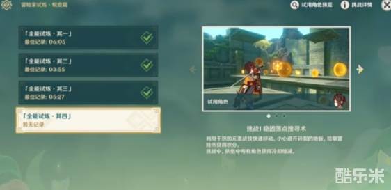 《原神》冒险家试炼蜕变篇第四天共有3个挑战,玩家只需达到对应条件即可快速通关,其中需要选择合适的角色,下面酷乐米小编为大家整理了详细的冒险家试炼蜕变篇第4天攻略,感兴趣的不要错过了。