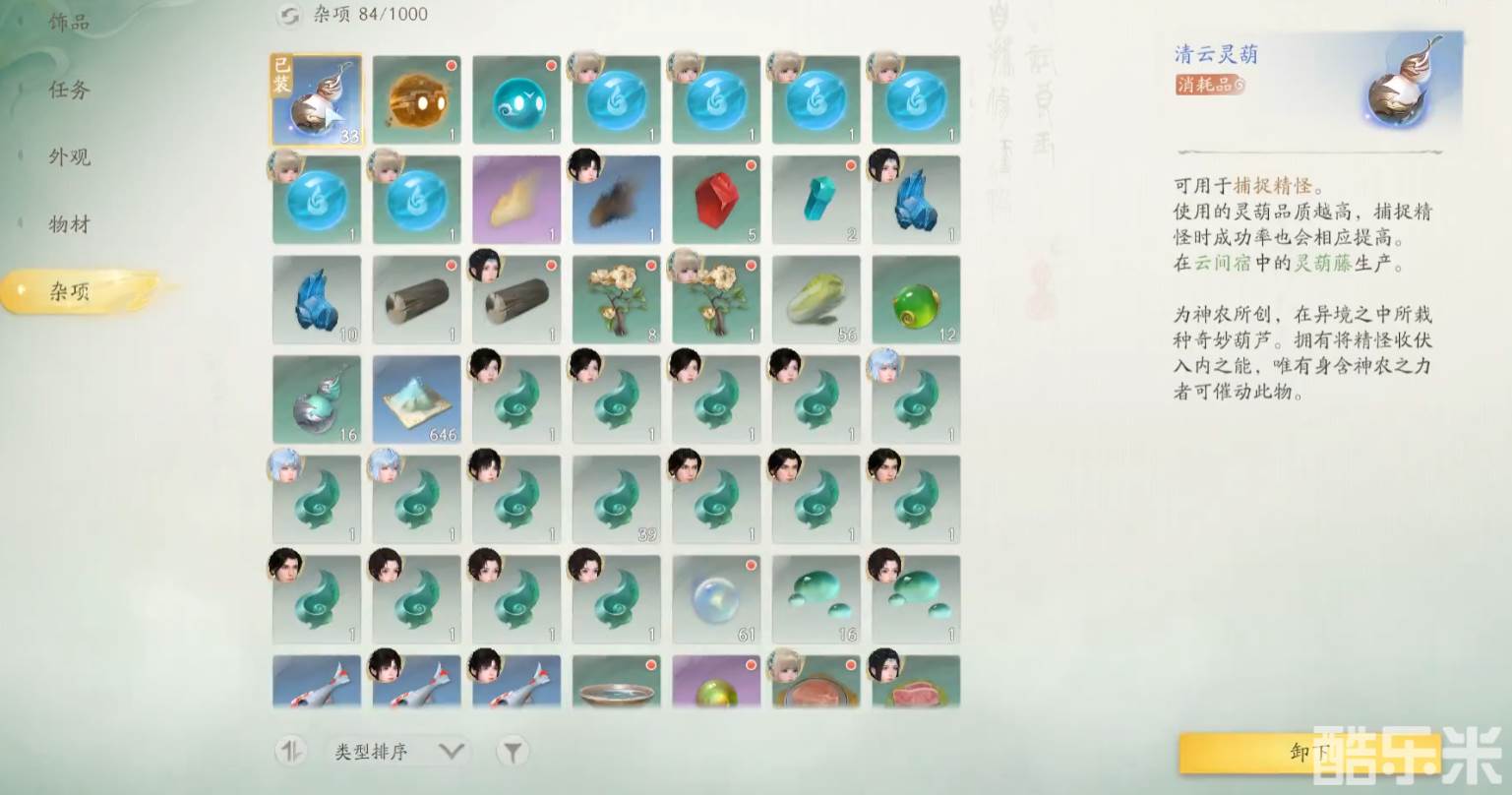 想要捕捉的话,我们可以打开背包。接着找到杂项里面的清云灵葫,这种道具可以用来捕捉宠物。若是灵葫的品质越高的话,可以捕捉到小火灵的成功率也会越高。想要获取该道具,可从云间宿里面的灵葫藤获取。
