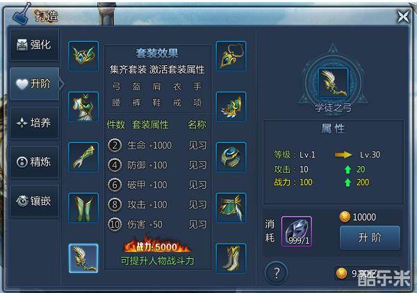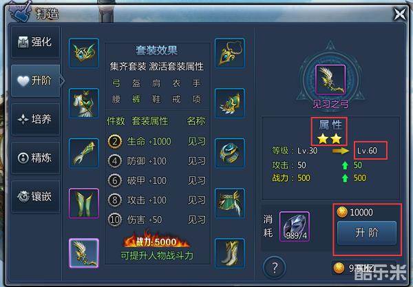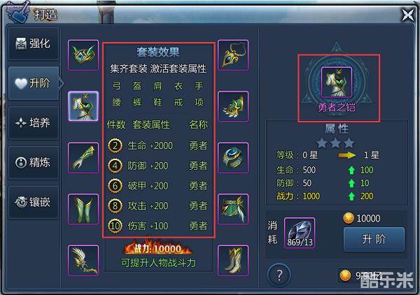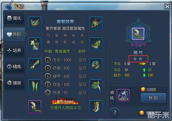消耗黑曜石与金币可以对基础装备进行升阶啦,升阶之后蓝色装备会变成紫色,并且多了星级评定,进入升星的世界,原来是来自星星的装备呢。