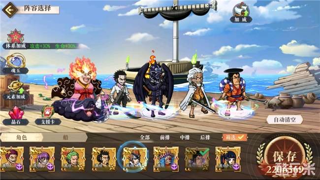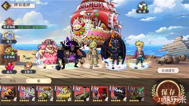 推荐阵容二:SSS大剑豪·米霍克(潜能之力五星)SSS光月御殿+SSS烬+UR和之国.大妈+SS+雷利。专属船只:UR棺船。