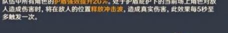 队伍中所有角色的护盾强效提升20%。处于护盾庇护下的当前场上角色对敌人造成伤害时,将在敌人的位置释放冲击波,造成真实伤害,此效果每5秒至多触发一次。
