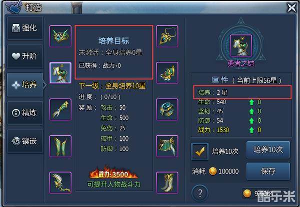 当培养的属性当培养的值达到一定时,会提升培养的星级,全身装备打到对应目标时,会额外激活属性。