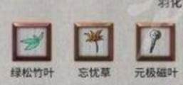 4、我们还需收集材料,材料有绿松竹叶、忘忧草、元极磁叶、太乙真金、天一真水、青冥矿、紫霄空心竹、凤羽中的四件以及羽化丹。