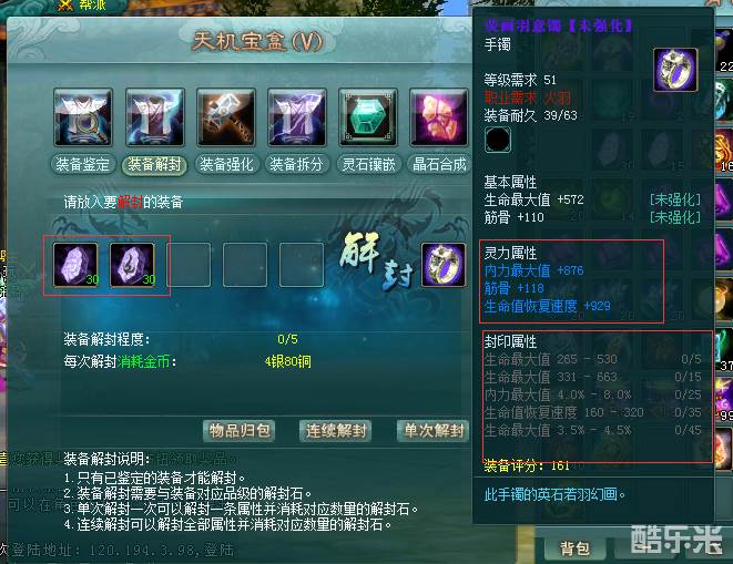 装备拆分:将装备分解成不同的材料,可获得经验丹药、解封石、强化石等。