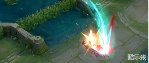 4、三技能:向前劈出一个青色的光刃,尾端带有暗红色的特效。