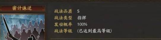 战斗中,我军主将造成伤害(大于300)后,有50%概率使敌军单体造成最终伤害降低15%(受统率影响,持续2回合,可叠加3次),且前2回合有50%概率(受统率影响)令主将对敌军全体造成1次兵刃伤害(伤害率25%,受主将统率影响)
