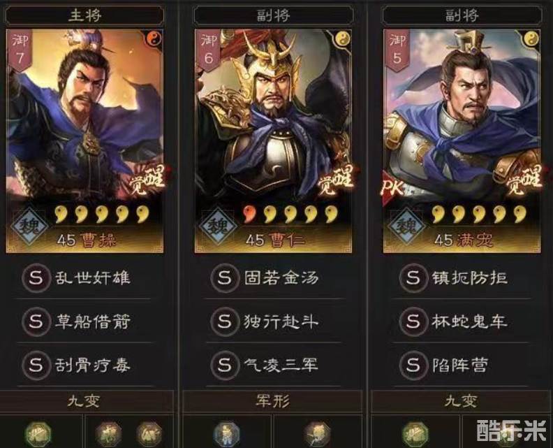 有两组平平盾刷战功比较不错,第一组由曹操、满宠和曹仁组成的魏盾,战法搭配如下图。这队的战法只要多叠恢复战法就能战平,基本上强度都不会差太大,还是非常不错的,作为一队专门牵制对面然后吃战功非常的爽。