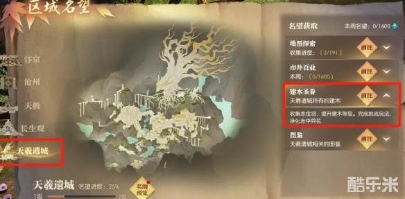 3、图示位置找到第四根然后打开区域名望选择【天羲遗城-建木圣眷】;