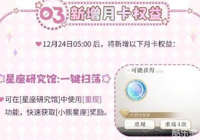 光与夜之恋计划在12月24点进行不停服更新,在此次的版本更新后将会上线全新的月卡权益,花费30元购买月卡的玩家将会享受新的权益,同时新增的权益也是玩家们比较关注的,下面酷乐米小编给大家带来《光与夜之恋》新增月卡权益介绍,感兴趣的继续往下看看吧。