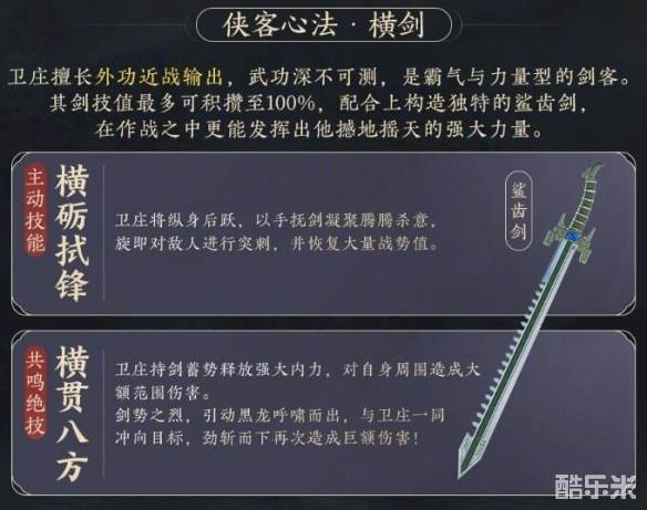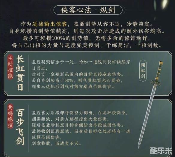 近战输出侠客,自身积攒的剑势值越高,则每次攻击所造成的额外伤害越高,最多可积攒100%的剑势值。