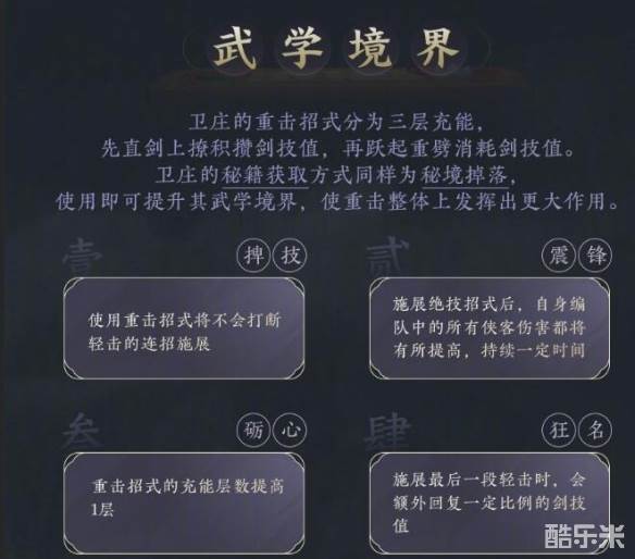 2、震锋:施展绝技招式后,自身编队中的所有侠客伤害都将有所提高,持续一定时间