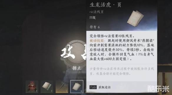 生龙活虎是燕云十六声当中的一个心法,很多玩家不清楚怎么获得,玩家可以在七伐坡击败张豹和攻占龙虎寨收集残页合成获得,接下来酷乐米小编给大家带来了详细的《燕云十六声》生龙活虎获得方法,希望这篇文章可以帮到大家!
