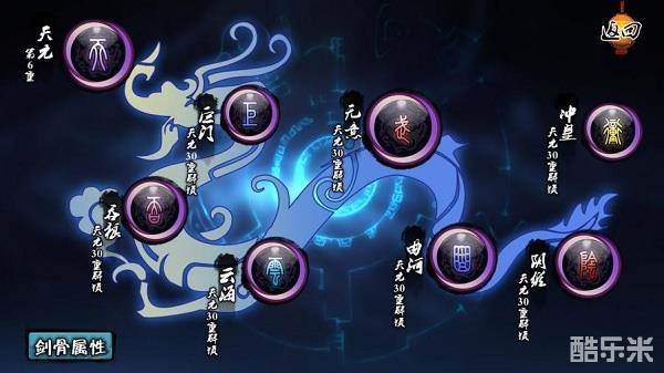 每个玩家都九个剑骨,分为巨门、天元、曲河、吞狼、云海、武意、阴维、冲皇、玉堂