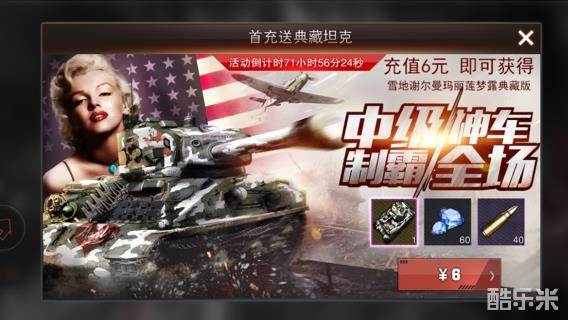 首次充值就会有高级货送给你,也许您不在乎钻石60颗,也许您不在乎炮弹40颗的实际价格,单纯的中级神车雪地谢尔曼就可以让你制霸全场,如果没有拥有他,您永远只是在观摩广告图片,等到真正拥有了才知道这款坦克的可贵之处。