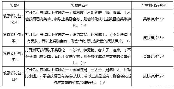 感恩节到来,小妲己也为大家在活动面板开启了永久英雄和永久皮肤的兑换活动。召唤师们兑换到包含永久英雄或皮肤的礼包后,若礼包内的英雄或皮肤全拥有,则会转化为相应数量的英雄或皮肤碎片,具体数量如下: