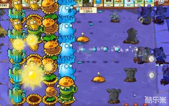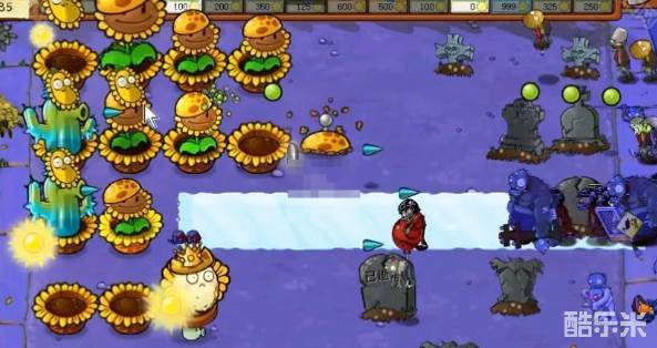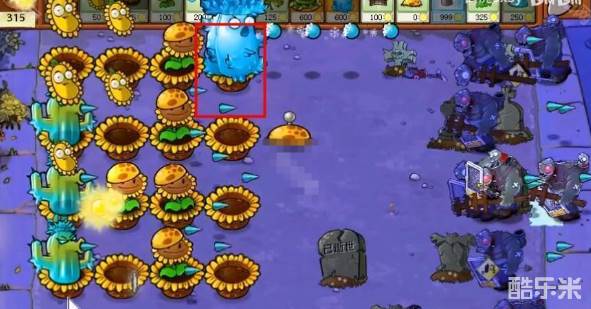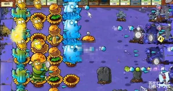 4、能量足够了后面一排就种植满寒冰仙人掌,前面可以放一些汉堡射手。