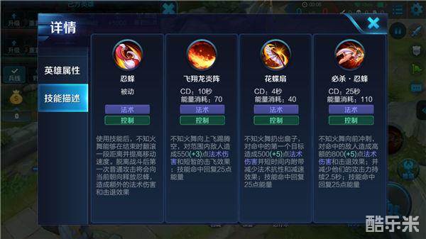 被动-忍蜂:不知火舞在使用技能后,能追加一次翻滚,并提高移速,脱离战斗后的第一次普攻,会造成额外的法术伤害和击退效果。