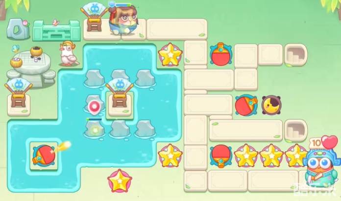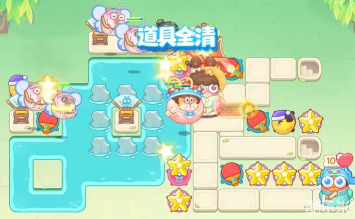 3、往右侧开图,清理右边上方和下方的道具,同时补充星星和乒乓球;