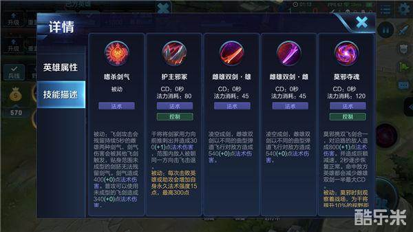 一技能-护主邪冢:干将莫邪击退面前范围内敌人并造成法术伤害。被动:每次击败英雄或者助攻时,将会永久增加干将莫邪的法术强度(有上限)。