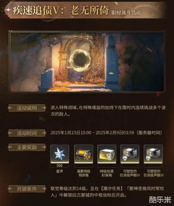 鸣潮2/0版本中会开放一系列新的活动,其中有这么一个活动叫做疾速追债V:老无所倚,完全需要通过战斗来获取限时奖励,那么下面和酷乐米小编一起来看看吧