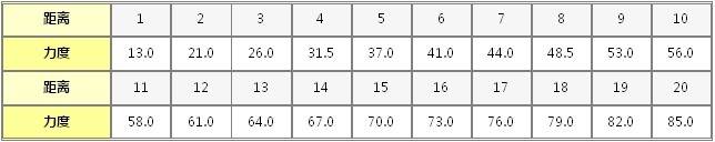 在面对对手的情况下,使用“↑ ↓”键将角度盘中显示的角度调整到65,测量自己与对手的距离。测距完毕之后参照下列公式进行发射炮弹的力度调整,下面65度不同距离使用的力度: