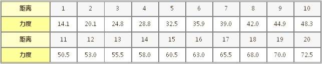在面对对手的情况下,使用“↑ ↓”键将角度盘中显示的角度调整到50,测量自己与对手的距离。测距完毕之后参照下列公式进行发射炮弹的力度调整,下面50度不同距离使用的力度:
