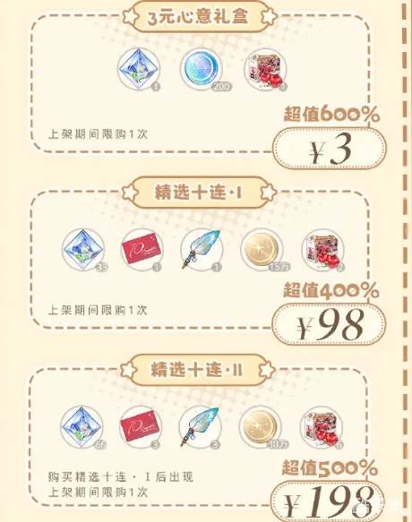 4、[绒絮盈心]十连补给礼盒:售价88元,含十连签收券x1、羽毛笔x5、极光币x100000、眩光砂砾x400,上架期间限购2次。