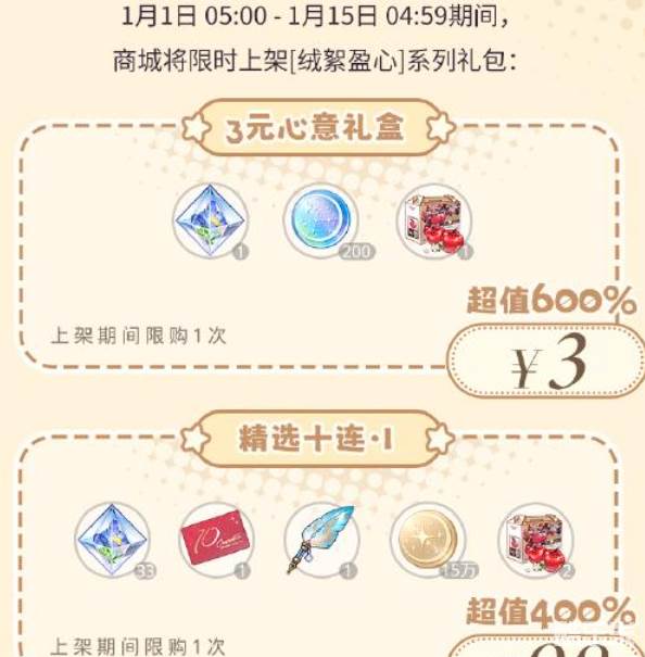 答:包含3元心意礼盒、精选十连·1、精选十连·2等多个礼包