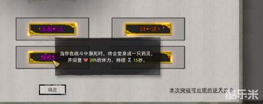 在游戏当中这种蘑菇是在突破境界时可以服下它,然后就可以获得前置的气运蘑灵仙力,在成功服下这个蘑菇之后,玩家在战斗过程如果进入到濒死状态,那么就会变身成为一只妖灵,并且回复30%的体力,该状态可以持续长达15秒之久,如果能够在后期升级为蘑灵神力,那么在血量回复和体力回复上会更高一些。而且在战斗过程当中,尤其是面对一些比较强大的boss能够进入到持久战争。除此之外,玩家还可以获得血魔大法通过该妖兽材料的加持,在境界突破上也可以将血魔大法发挥到极致